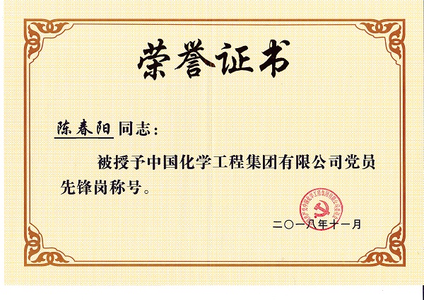 近日,公司施工管理部/安全生產部黨支部陳春陽同志被授予中國化學工程集團有限公司“黨員先鋒崗”稱號。