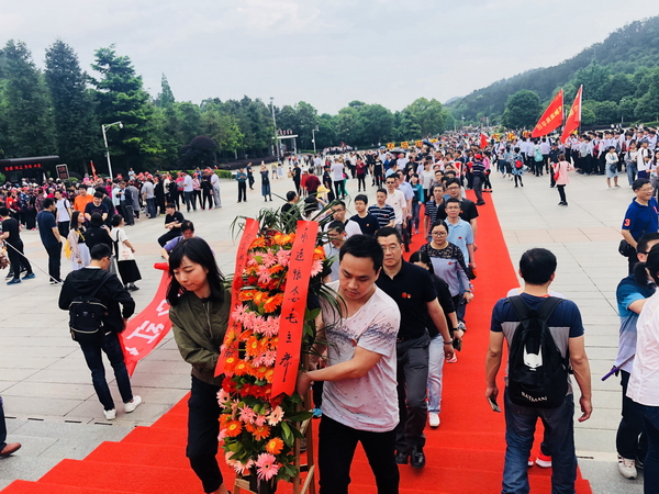 在毛澤東銅像廣場,人頭攢動,這里寄托著韶山人民對偉人的思念,同時也寄托著全國人民對偉人的思念。毛主席銅像身著中山裝,手握文稿,面帶微笑,目光炯炯,正視前方,巍然挺立。10.1米高的銅像帶給大家的不止是視覺上的震撼,更多是心靈上的思索、精神上的洗禮。鮮花祭忠魂,光輝照后人。站在銅像腳下,黨員同志們列隊鞠躬,為偉人獻上了花籃,黨員同志們莊嚴承諾,將以共產黨員的標準嚴格要求自己。那一刻,大家心中對共產主義的信仰更加堅定,對那面鮮紅的黨旗也有了更深的理解。