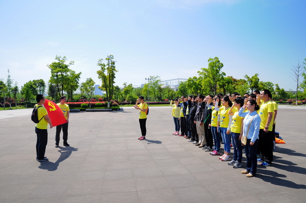 到達全國愛國主義教育示范基地——渡江戰役紀念館,看到巨大的紀念館館身猶如兩艘雄偉戰艦并排行駛在浩瀚的江面上,每位黨員都不禁為之一震。大家首先來到渡江戰役總前委群雕前,向五位總前委致敬,并合影留念。接著支部書記毛先勝帶領全體黨員來到五角星勝利塔下,面向鮮紅的黨旗,舉起右手,莊嚴宣誓。在這樣神圣的地方,通過重溫入黨誓詞,警醒大家不忘入黨初心,始終以實際行動踐行誓詞。宣誓完畢后,按照支部年度計劃安排,毛書記組織大家召開了一次支部會議,主題為“討論鄒煒同志按期轉正事項”。鄒煒同志由于預備期間表現出色,在完成會議的各項議程后,在同志們熱烈的掌聲中,大家一致同意她按期轉為中共正式黨員。