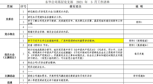 東華科技黨委積極響應相關工作部署和要求,及時將習近平總書記在廣西考察期間重要講話精神作為黨史學習教育的一項重要內容。5月6日,五一假期后上班第一天,公司黨委就將《習近平總書記在福建考察、廣西考察調研時的重要講話精神》納入了《東華公司基層黨支部2021年5月份工作清單》并向各基層黨組織發起學習研討任務要求。