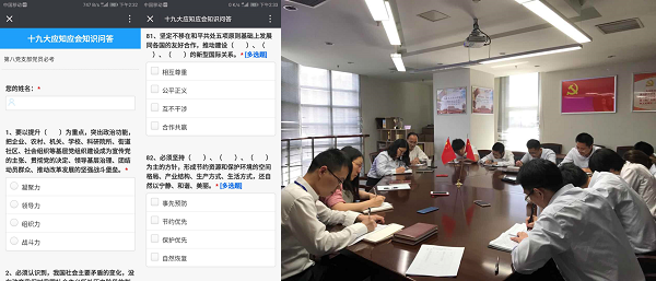 此次黨章和黨的十九大精神應(yīng)知應(yīng)會知識測試,緊密圍繞黨章和十九大報告,包含了中國共產(chǎn)黨的歷史使命、習(xí)近平新時代中國特色社會主義思想和黨的執(zhí)政能力建設(shè)等要點,內(nèi)容全面,題型多樣。創(chuàng)新引入手機端答題方式,單選題、多選題均在“東華科技第八黨支部”公眾號上答題,支部參與率100%,并實時顯示用時、成績及排名,簡答題的筆試安排在A705會議室進行。